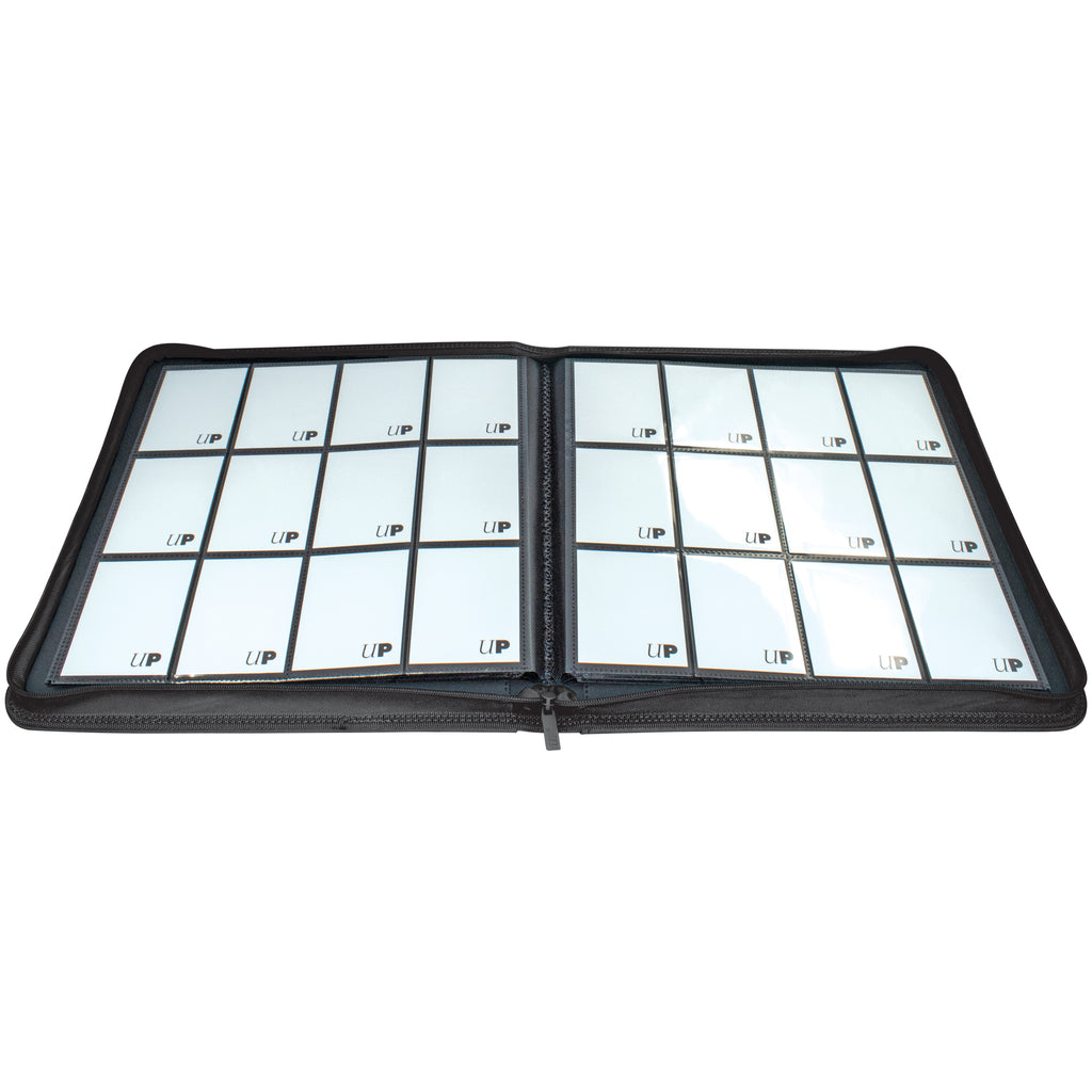 The Vivid 12-Pocket Zippered PRO-Binders are designed for collecting and organizing playsets of your favorite trading cards. Each binder features a padded leatherette cover with a matching zipper closure and pull tab. After unzipping the binder, you'll find twenty 12-pocket pages sized for standard trading cards in side-loading pockets, allowing you to store up to 480 cards in Deck Protector sleeves. Pages feature a low-friction black backing, creating a separation between the front and back pockets as well as providing cards a classic framed look. Every PRO-Binder is made with acid-free, non-PVC materials to ensure your cards are protected and preserved.